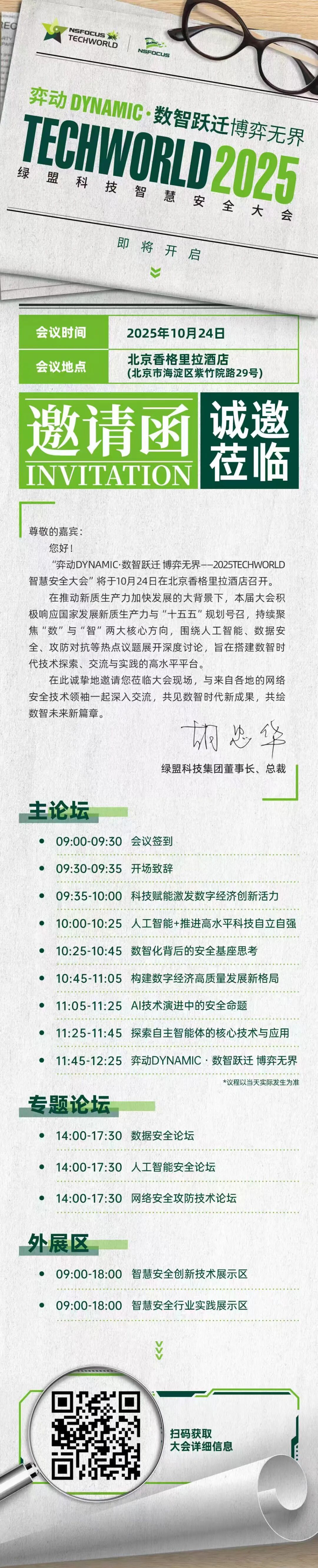 专攻术业,成就所托。绿盟科技(300369)TechWorld智慧安全大会已从一颗技术的种子,茁壮成长为一片安全创新的沃土。面对数智时代提出的安全新课题、新范式与新解法,2025年秋,绿盟科技再度整装出发,开启新一轮的探索与引领。